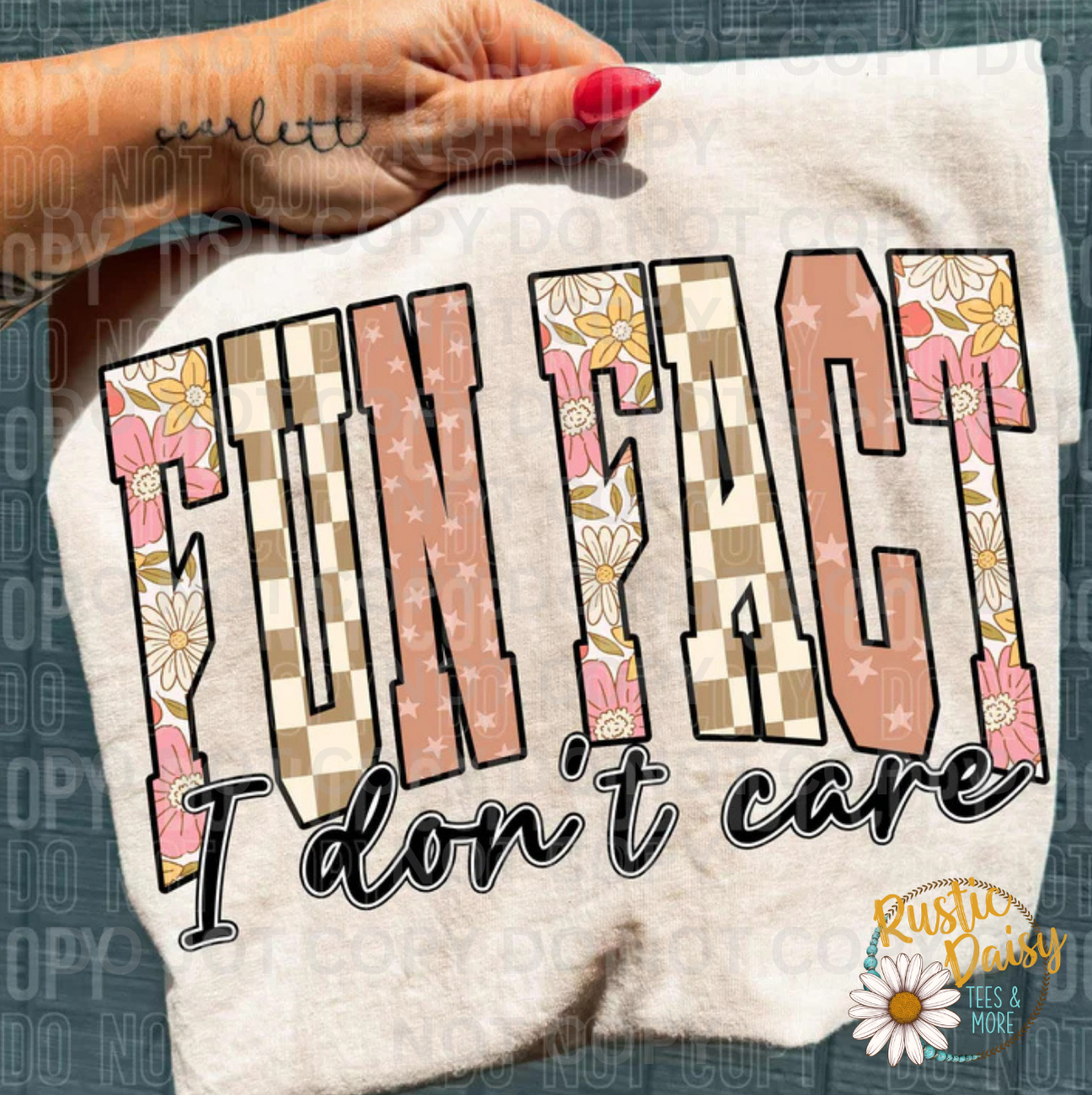 Make a bold statement with the playful Fun Fact I Don't Care design. Featuring eye-catching patterned letters, this fun and cheeky style adds a spirited touch to your casual wardrobe.