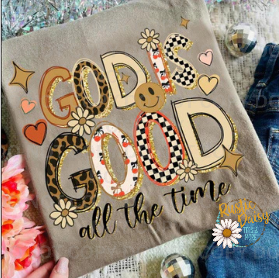 Spread joy with this playful "God Is Good" tee, featuring letters filled with a vibrant patterned design. This fun style adds a lively, uplifting vibe to your look while celebrating your positive spirit.