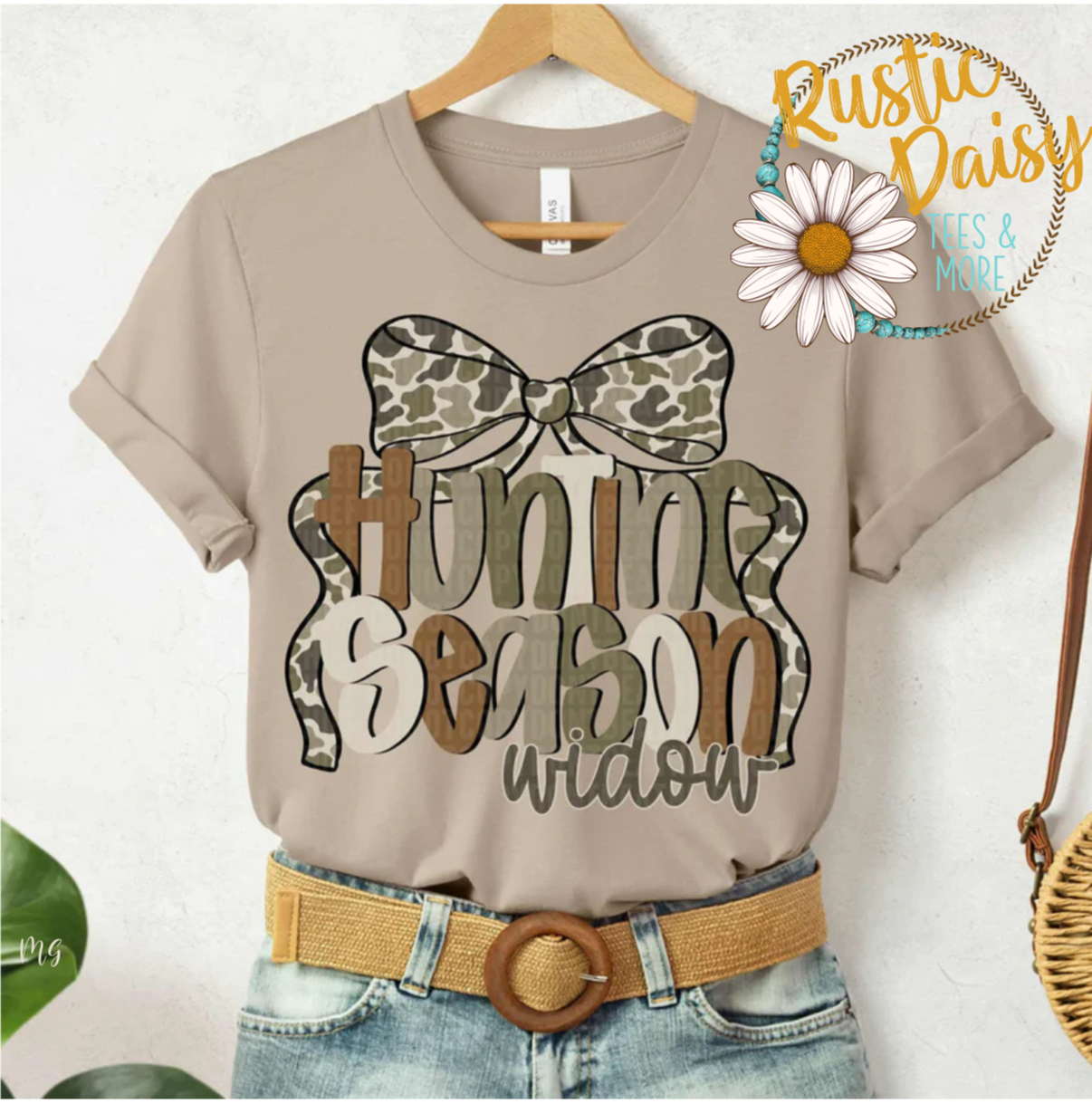 The Hunting Season Widow Camo Bow tee is designed for those supporting their loved ones during hunting season. Featuring a subtle camo design and cute bow graphic, this design is perfect for spending time outdoors or relaxing while the hubby is out in the field, embodying quiet strength and seasonal spirit.