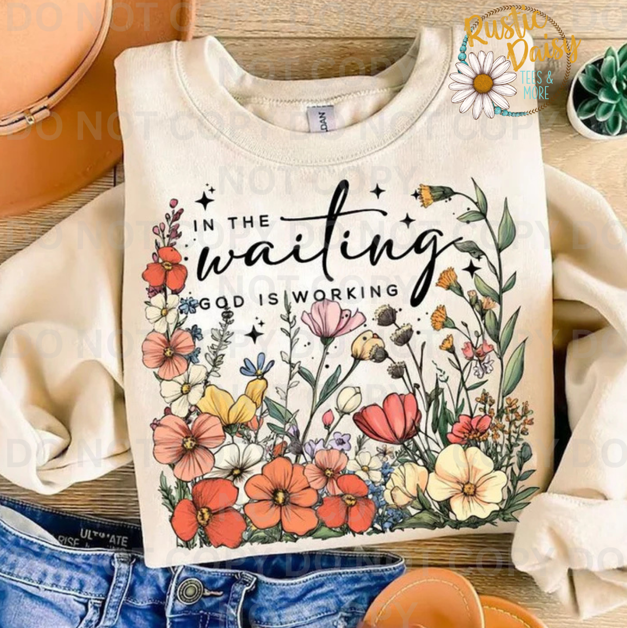 The "In The Waiting God Is Working" design features elegant typography that beautifully expresses faith, hope, and patience in a simple, timeless style.
