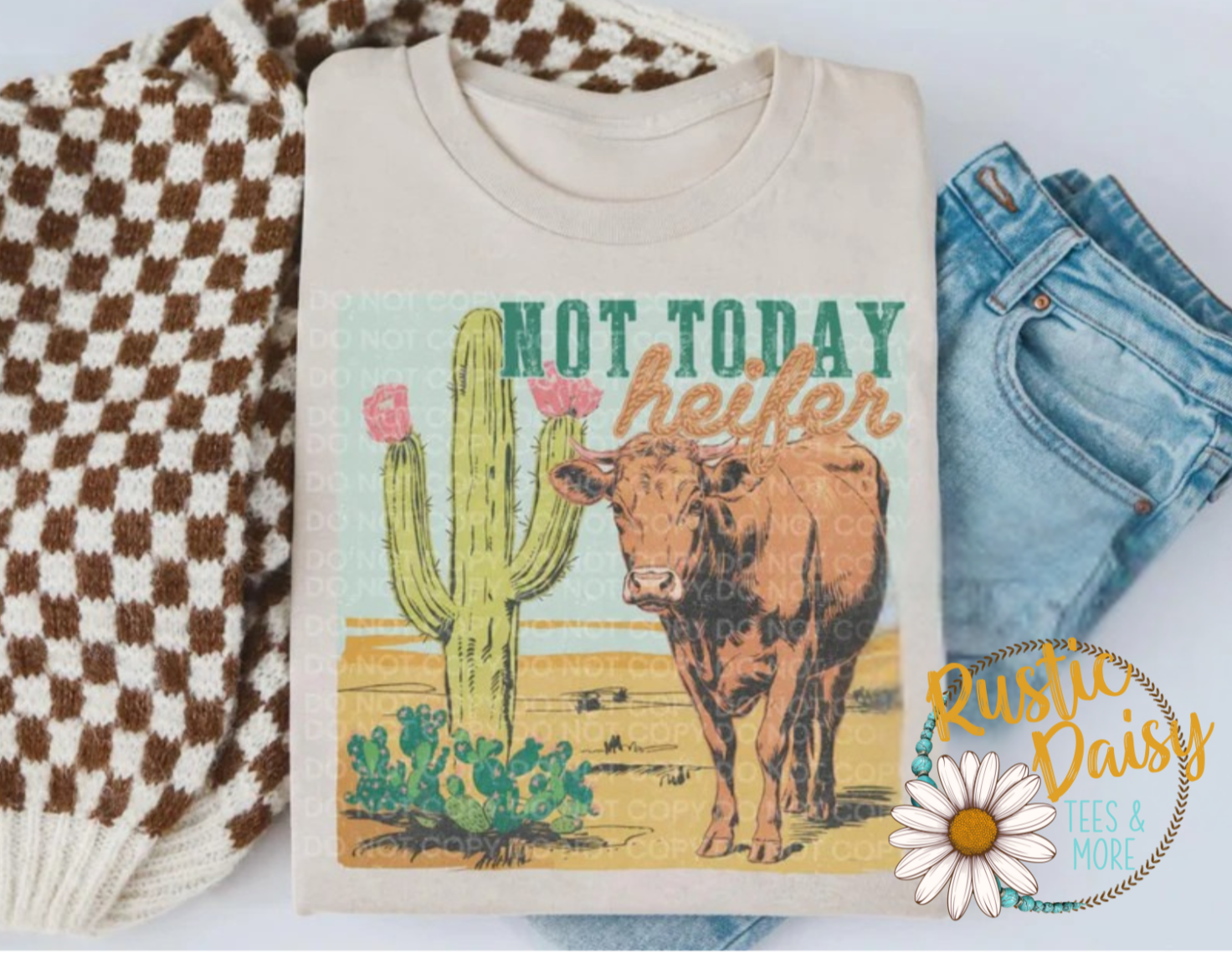Add a playful punch of western charm with the Not Today Heifer tee! Featuring a sassy cow, and a prickly cactus. This fun design brings a cheeky attitude and cowboy spirit to your everyday look. Perfect for those who love a little humor with their style!
