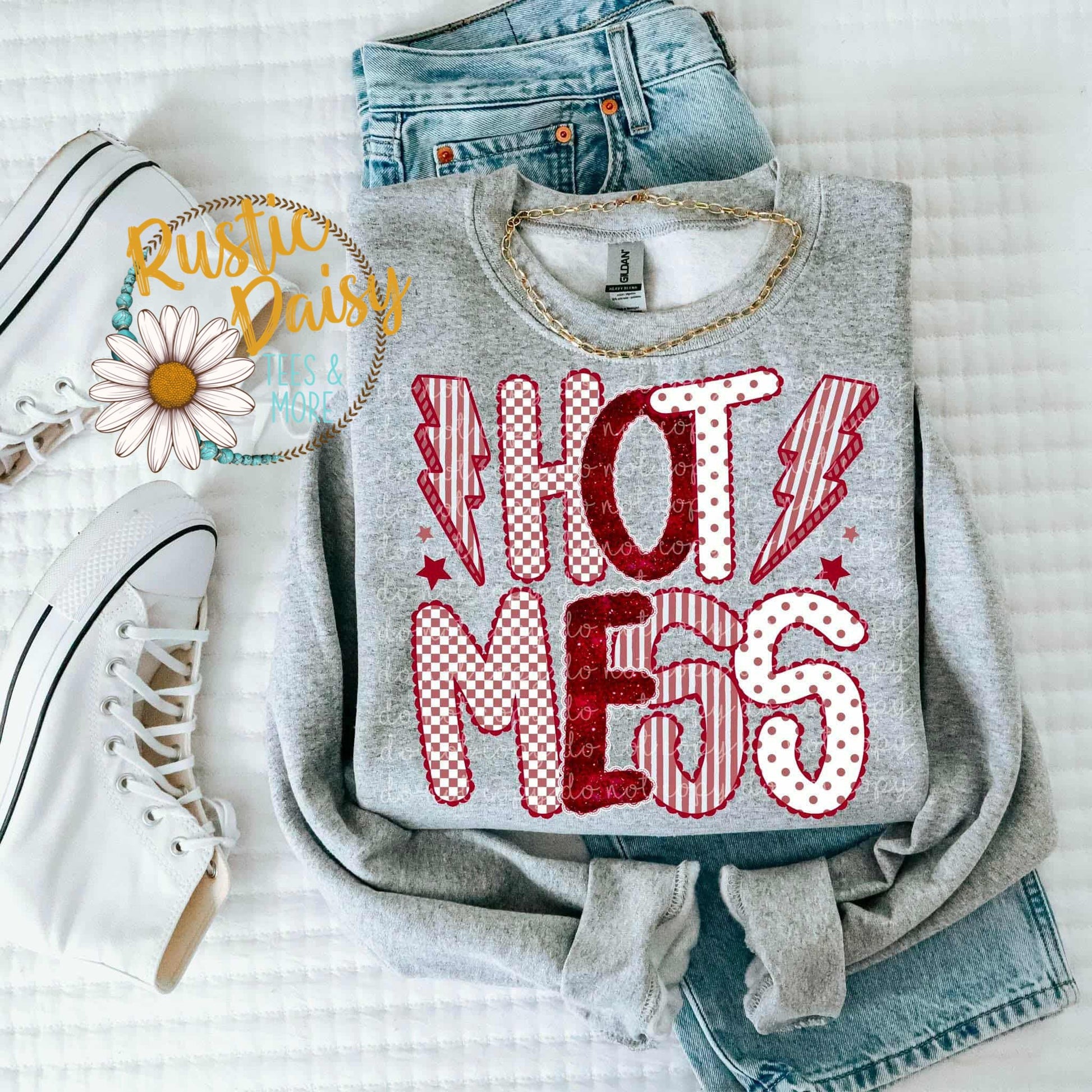 The "Hot Mess" design highlights red and white patterned letters with sharp contrast and clean detail, offering a stylish and confident look.